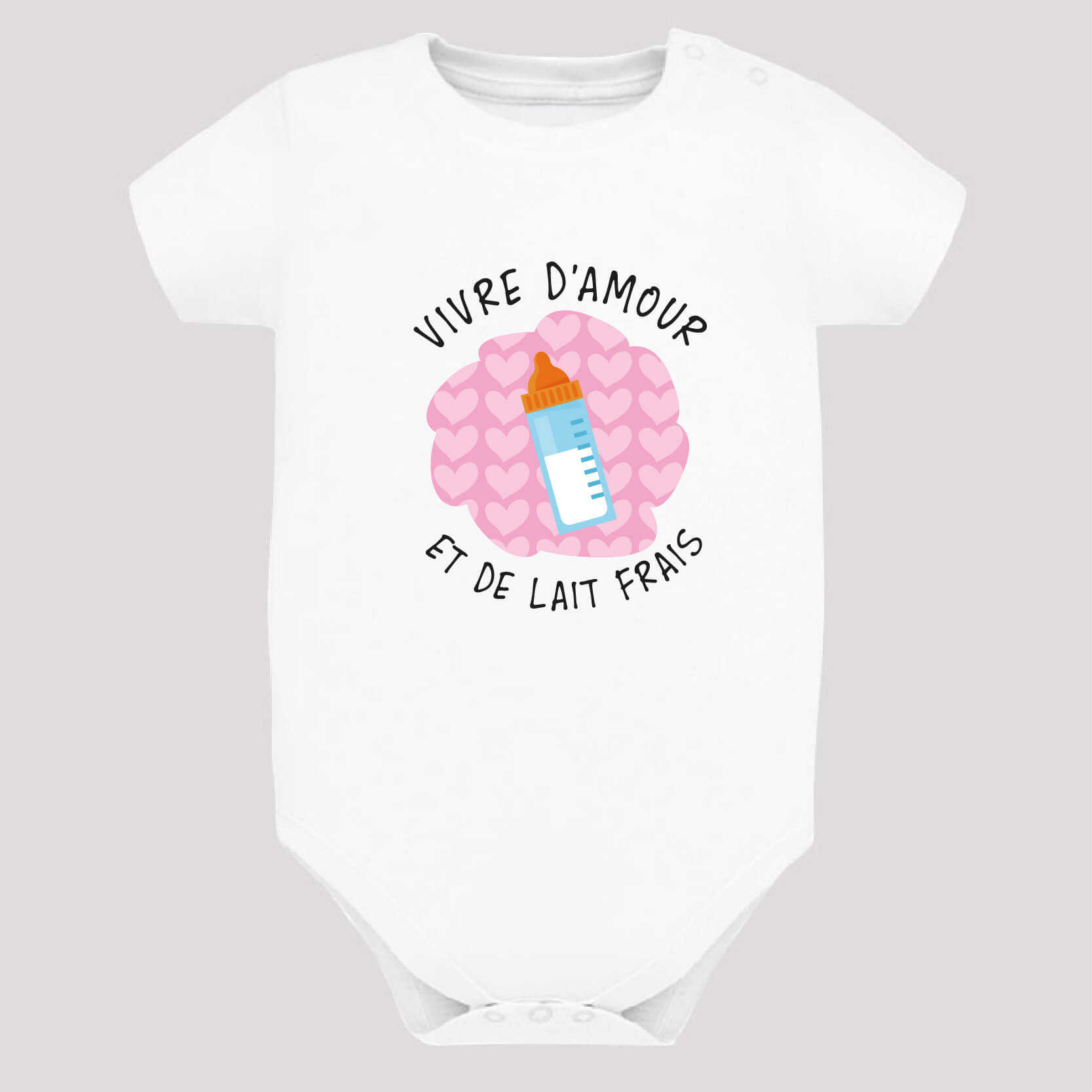 Body bébé Vivre d’amour et de lait frais avec plein de cœurs et un biberon