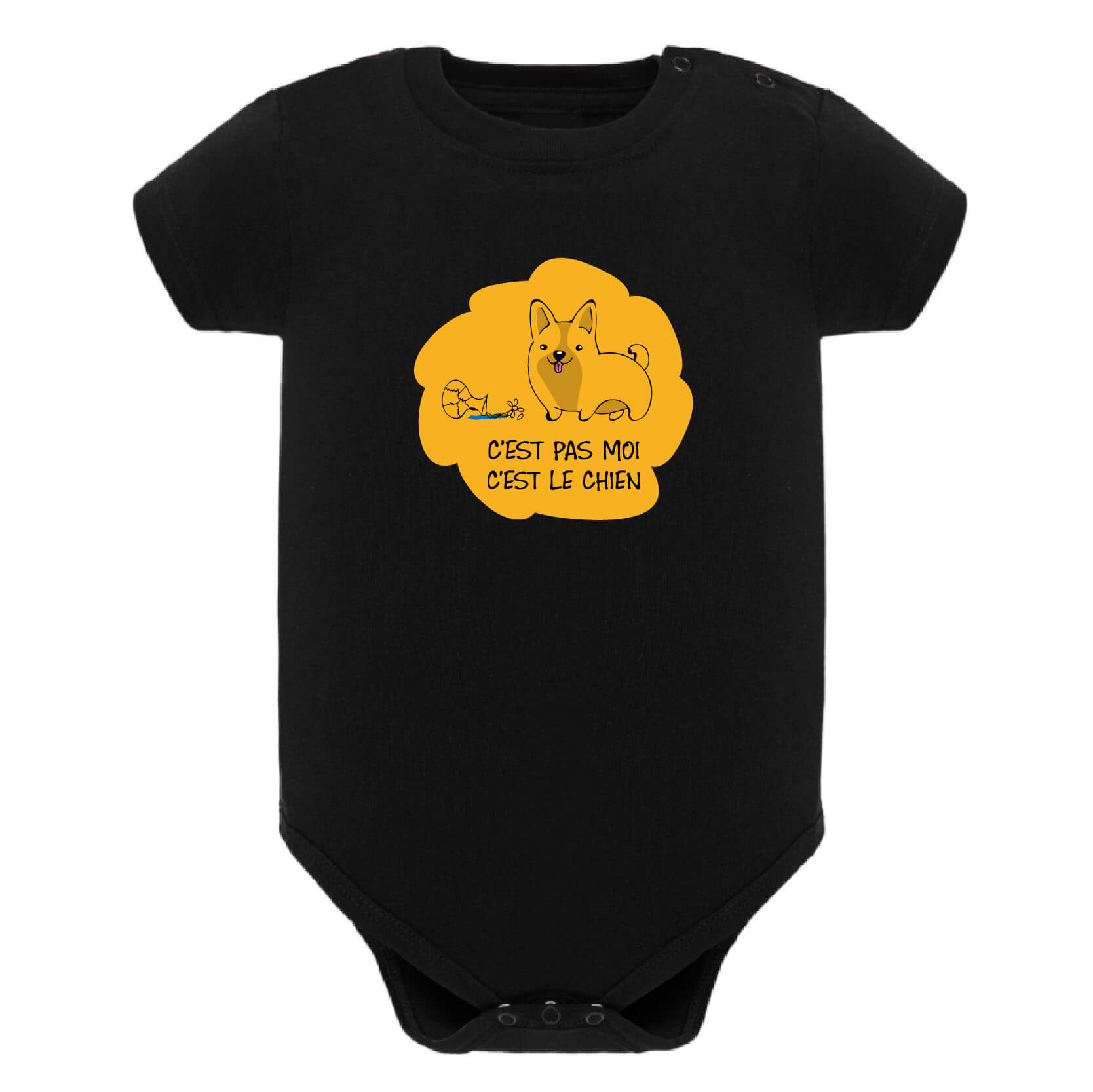 Body bébé rigolo « C’est pas moi, c’est le chien » avec un chien et un vase cassé.