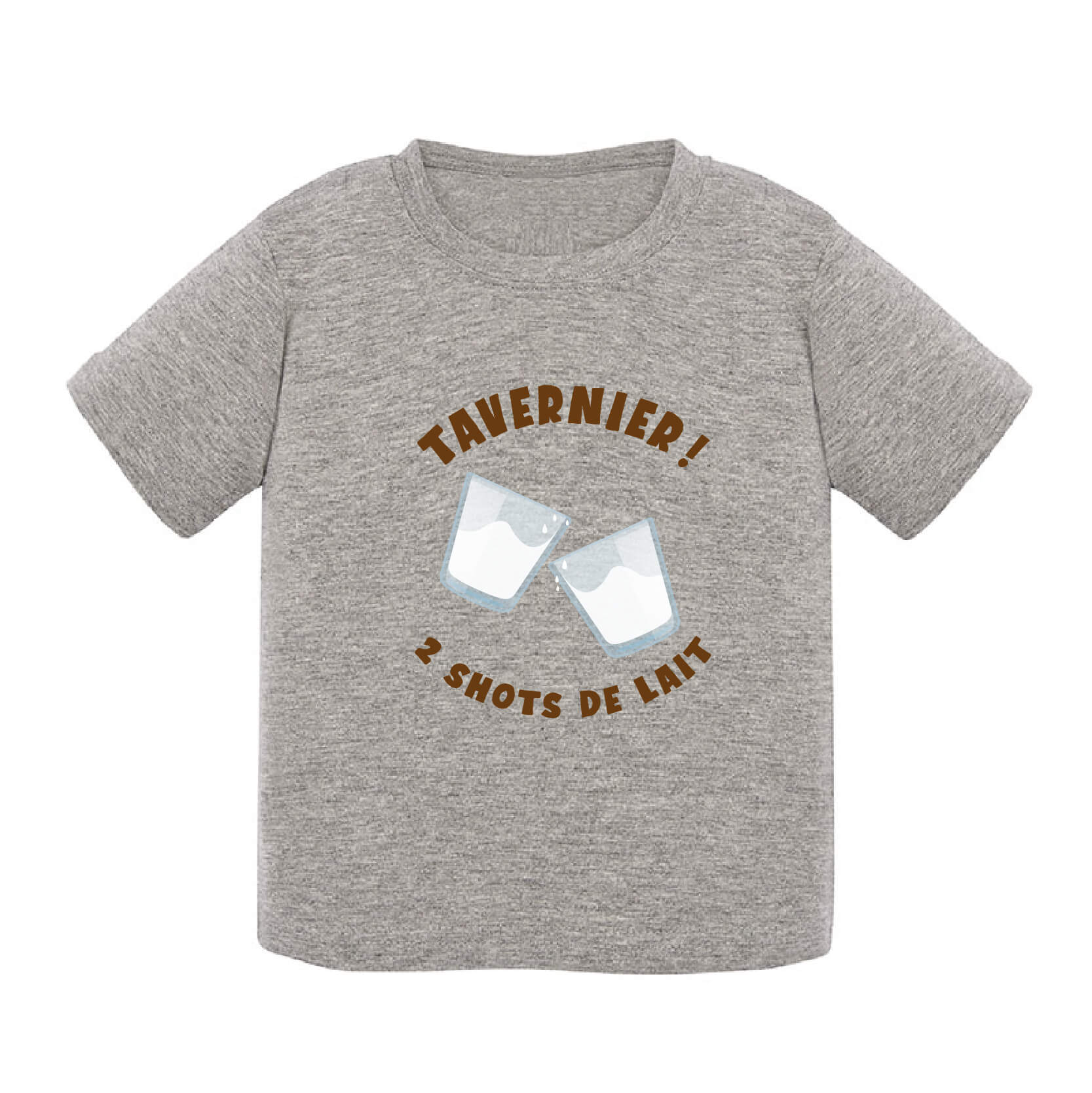 T-shirt bébé avec deux verre de lait et phrase marrante. T-shirt disponible en 12 et 24 mois.