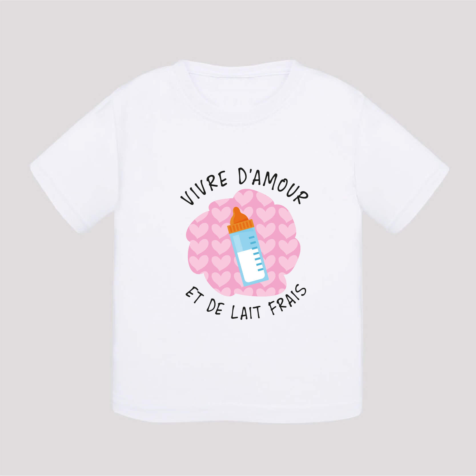 T-shirt vivre d’amour et de lait frais. Bébé a juste besoin ses parents pour être heureux en somme.